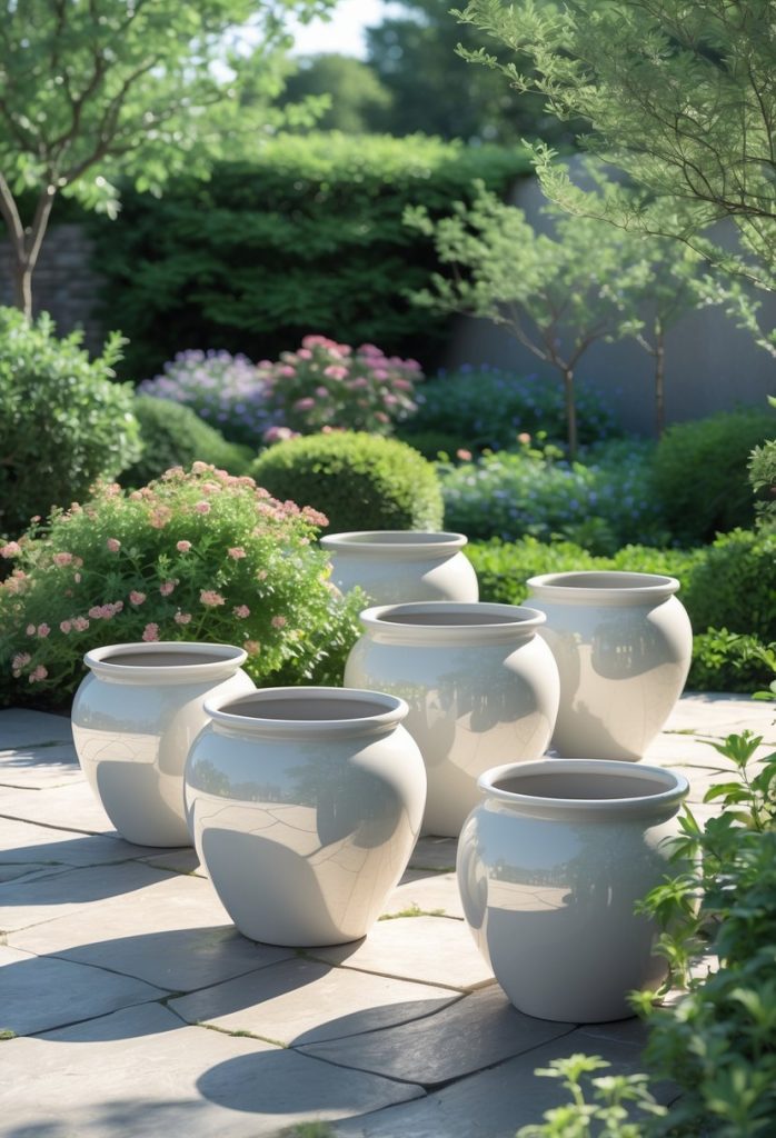 You can use ceramic pots in white or light colors to reflect sunlight. These pots help to keep your garden cooler by bouncing light away. Plus, they add a fresh and bright look to your outdoor space.