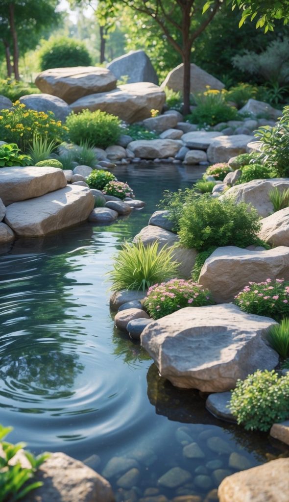 You can add a small pond to your garden and surround it with rocks. The rocks help keep the pond edges stable. They also create a natural look that makes your space feel peaceful and calm.