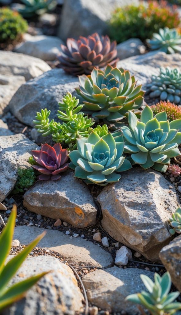 You can add charm to your rock garden by planting succulents in the small gaps between rocks. These spots give succulents the drainage they like.