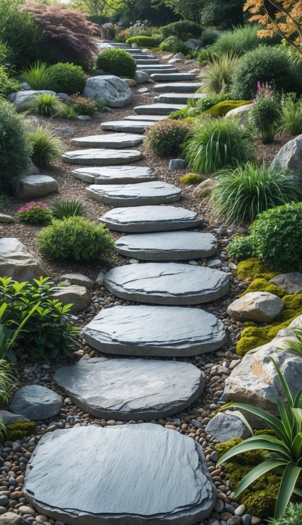You can add slate or flagstone stepping stones to create a clear path in your garden. They look natural and fit well with plants and rocks. These stones also make it easier for you to walk without damaging your plants or soil.