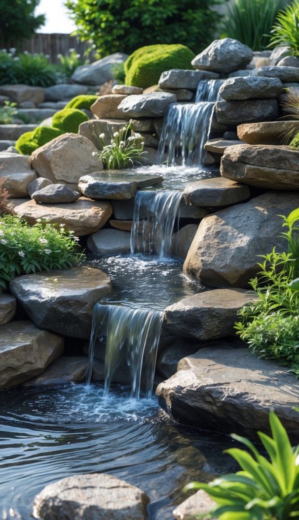 You can create a peaceful spot by adding a waterfall that flows over natural rocks. Using large, flat stones helps the water move smoothly, looking like a real stream in your garden. Surround the waterfall with plants that grow well nearby to make it feel part of nature.