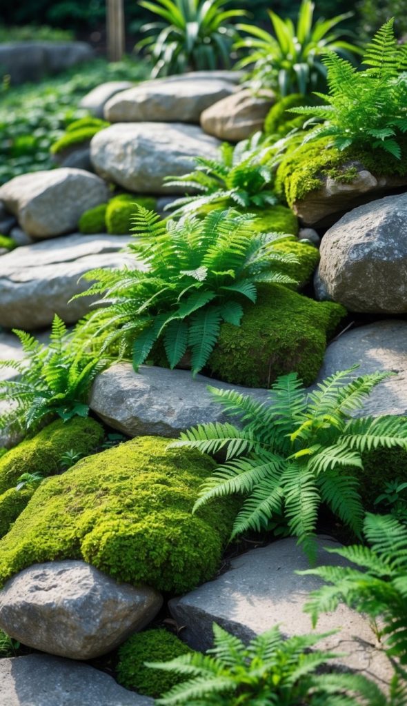 You can add soft moss and delicate ferns between your rocks to create a peaceful look. These plants thrive in shady, moist spots.