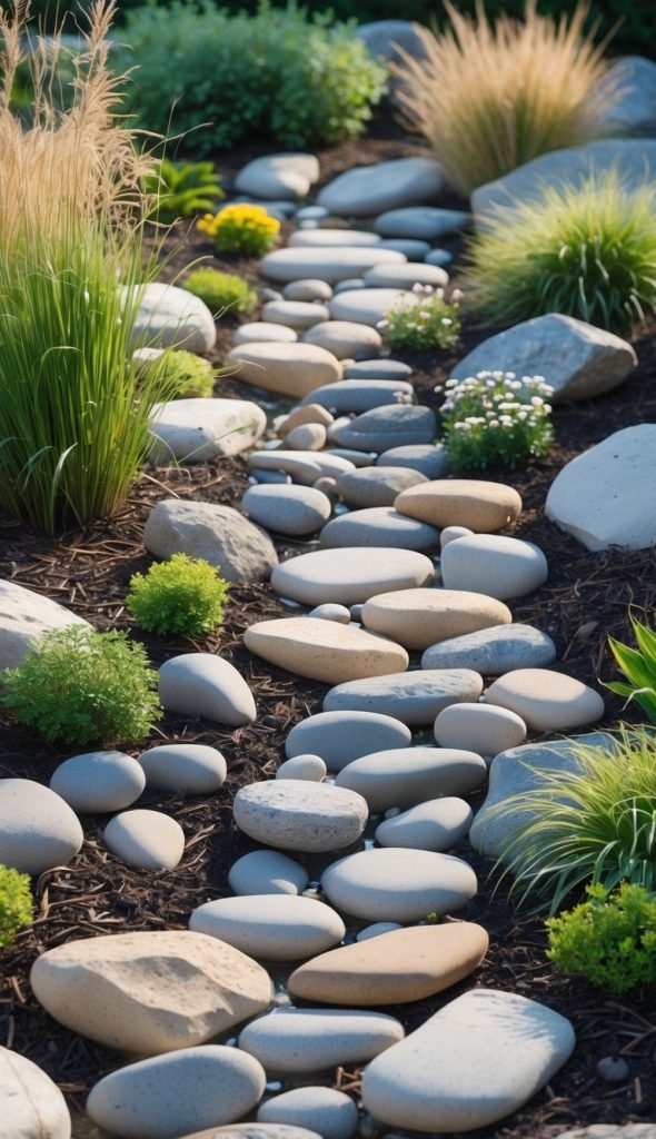 You can use smooth river stones to build a dry stream bed in your garden. It helps guide rainwater and stops puddles from forming.