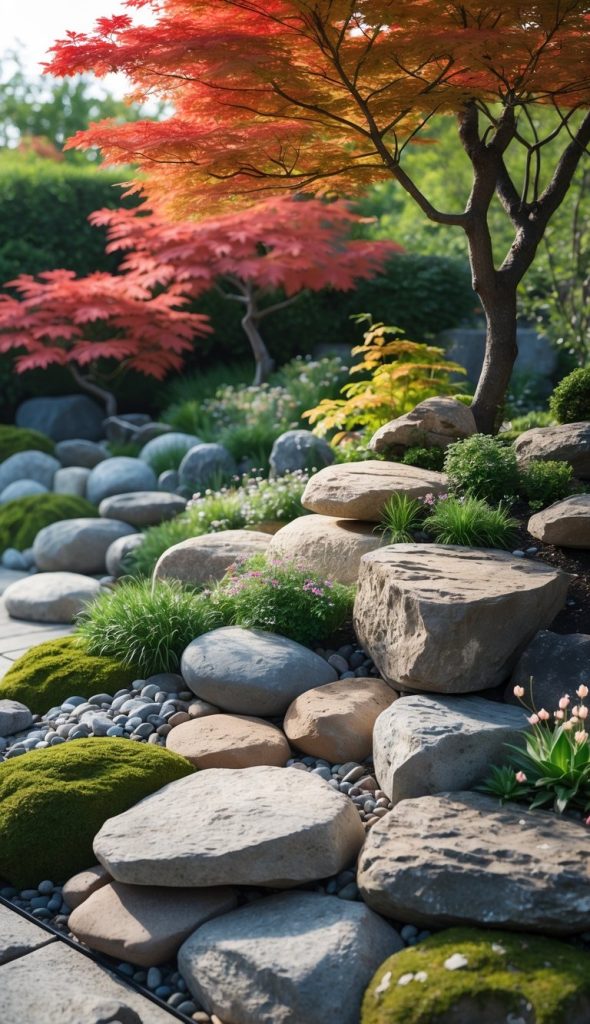 You can use Japanese maple trees to add bright color to your rockery garden. Their red and orange leaves stand out well against stones and greenery.
