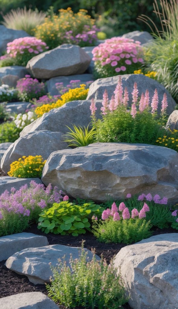 9. Blend large boulders with flowering perennials