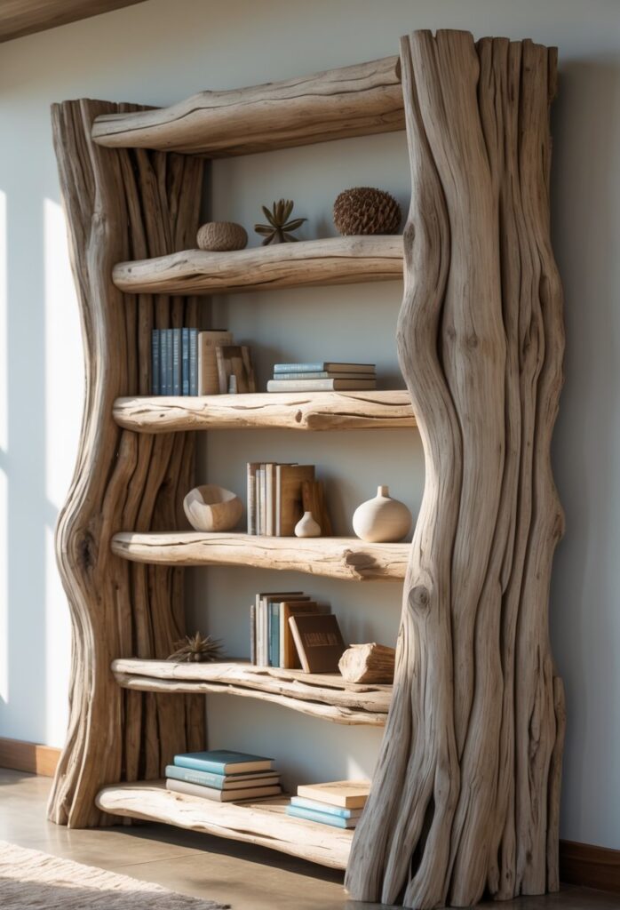 You can create a beautiful bookshelf using driftwood found on the beach. This natural wood adds a unique rustic charm to your space.