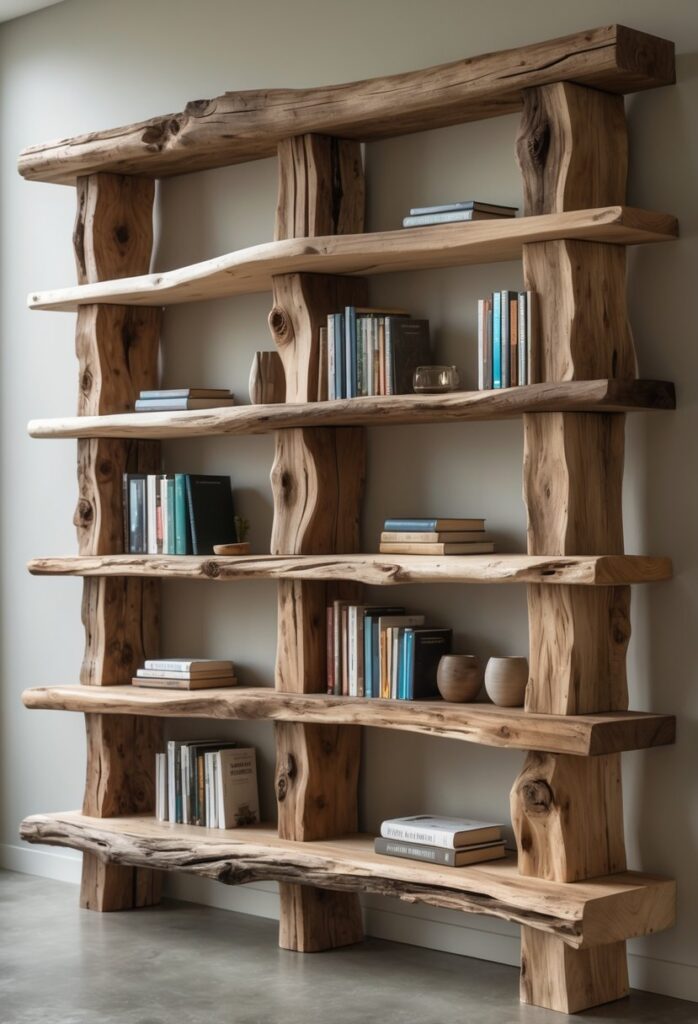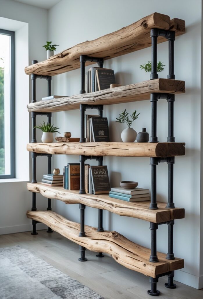 Using live-edge planks as the base gives you a strong, natural foundation. Driftwood shelves on top add a lighter, artistic touch. Together, they make your bookshelf stand out while keeping a cozy feel.