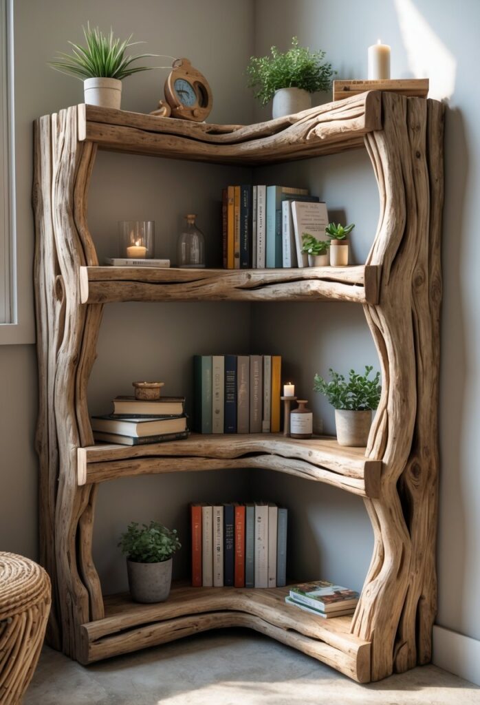 If you have limited room, a compact driftwood corner bookshelf is a great choice for your space. It fits neatly into corners, saving floor space while adding natural charm.