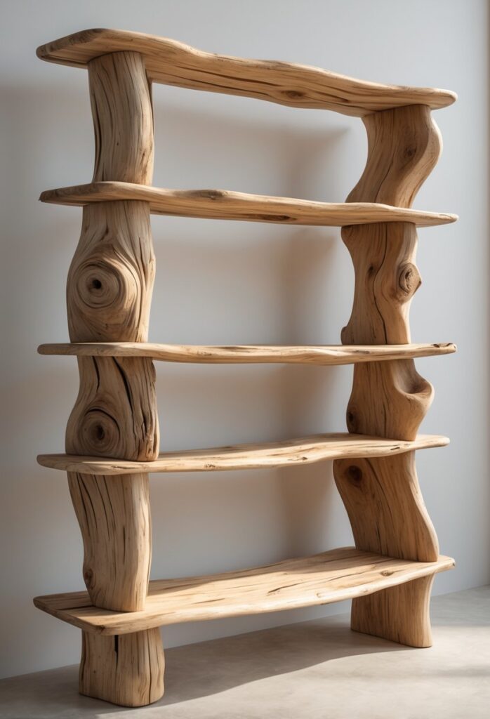 8. Minimalist driftwood bookshelf with natural knots and curves