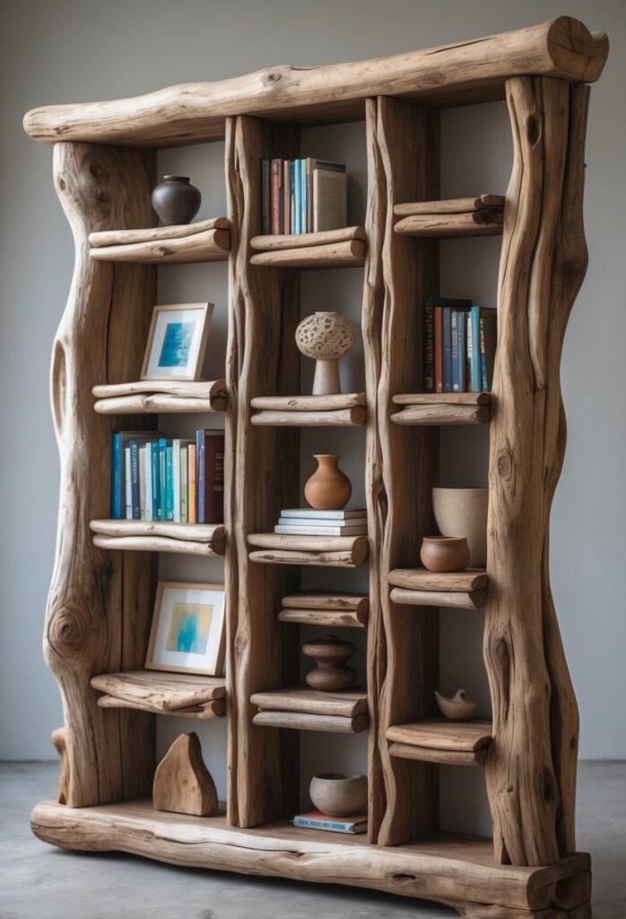 • 8. Minimalist driftwood bookshelf with natural knots and curves