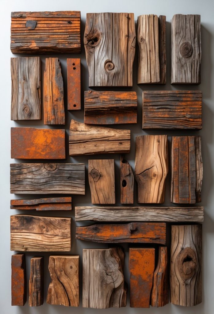 You can give your scrap wood art a rust-inspired finish to add a warm, vintage look. Using colors like deep oranges, browns, and reds helps create the feel of aged metal.