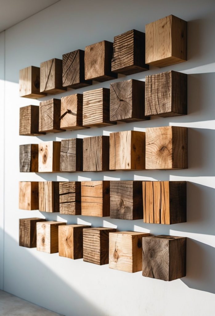 You can create simple, clean wall art using small wooden cubes. Cut scrap wood into equal cubes, sand them smooth, and arrange them in patterns that fit your space.
