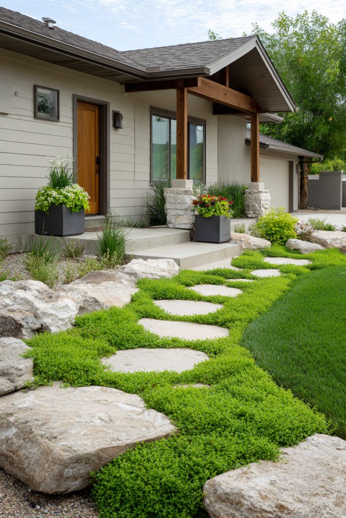 Creeping thyme is low-growing and smells nice when stepped on. It also stays low, so it won’t block your path. This idea adds charm and a natural feel to your front yard.