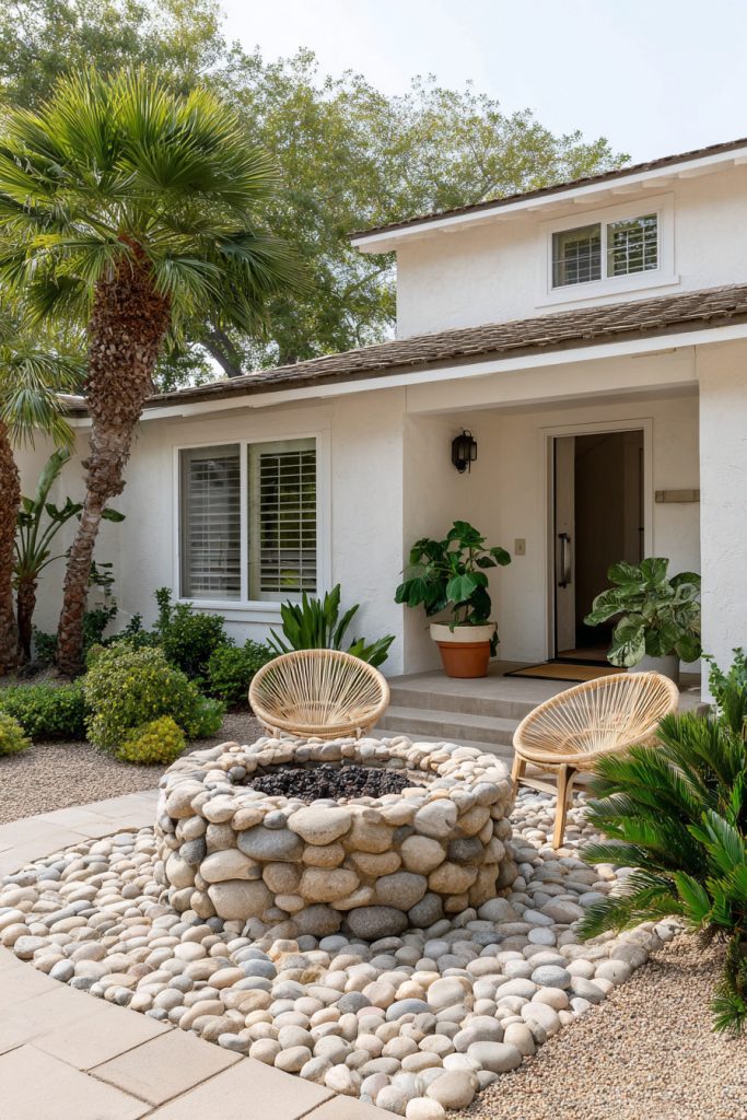 A circular stone fire pit makes a great focal point for your small front yard. It adds warmth and invites people to gather around.