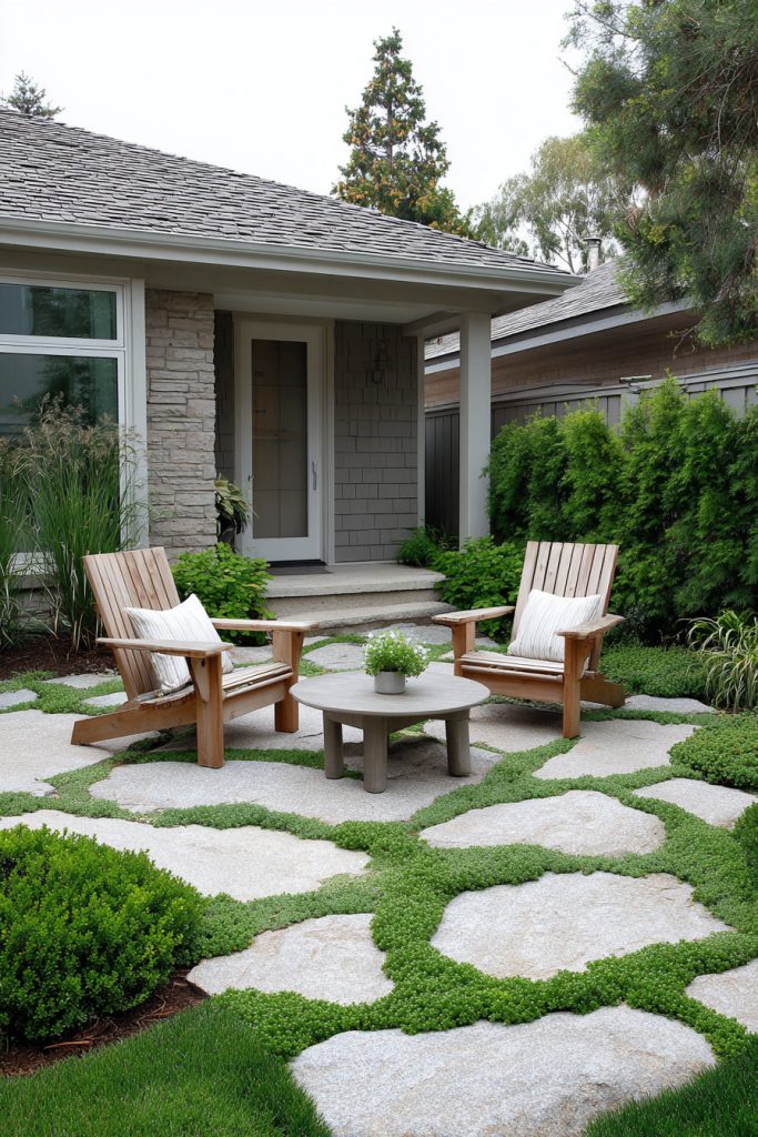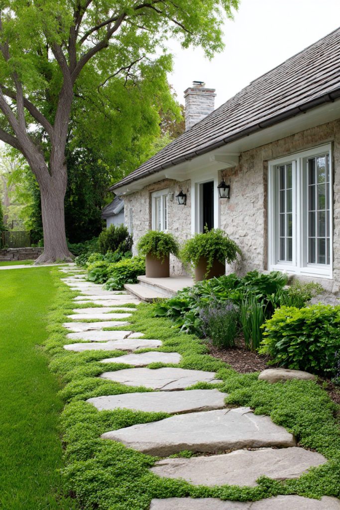 Plant low-growing ground covers like creeping thyme or Irish moss between the stones. This adds green color and softens the path’s look. It also keeps the area neat and easy to walk on.