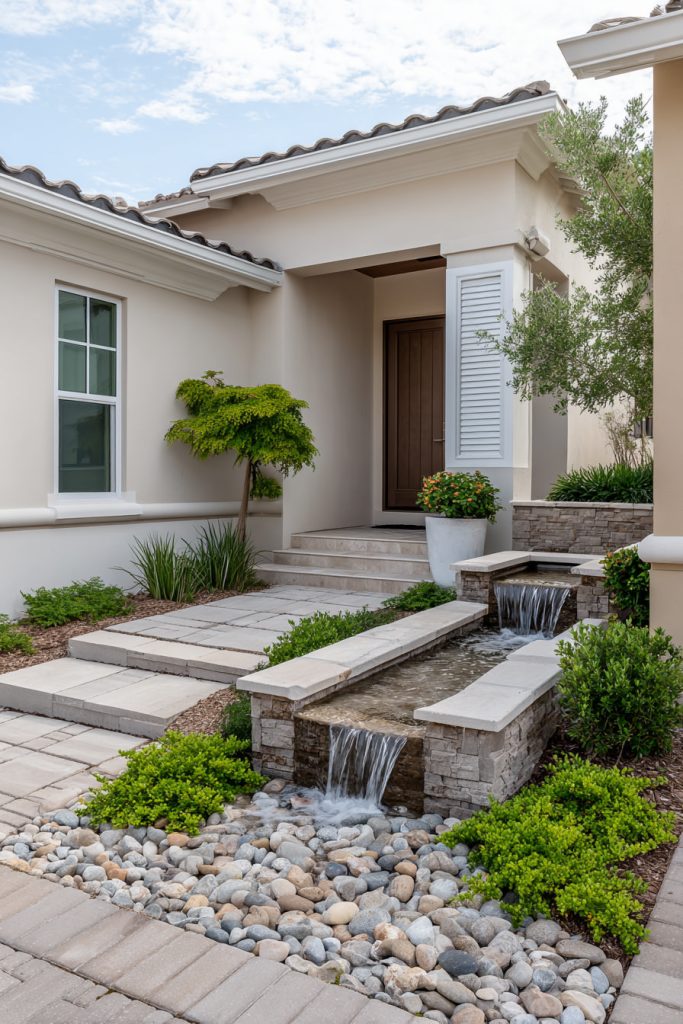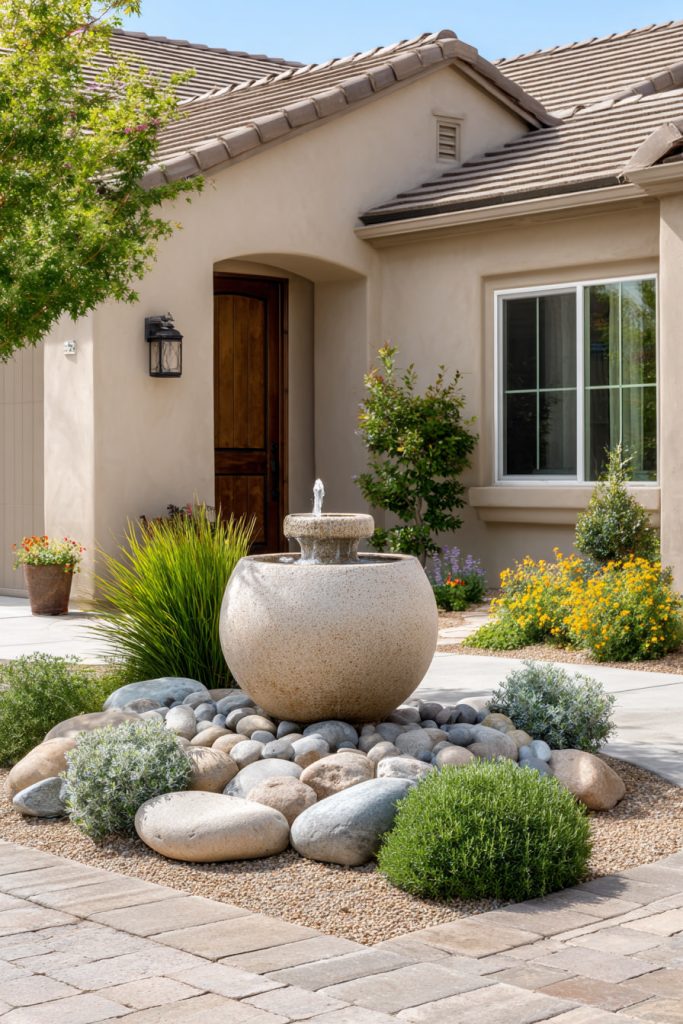 You can use a decorative stone fountain to create a calm, eye-catching spot in your front yard. The natural look of rough or smooth stones adds charm and blends well with plants.