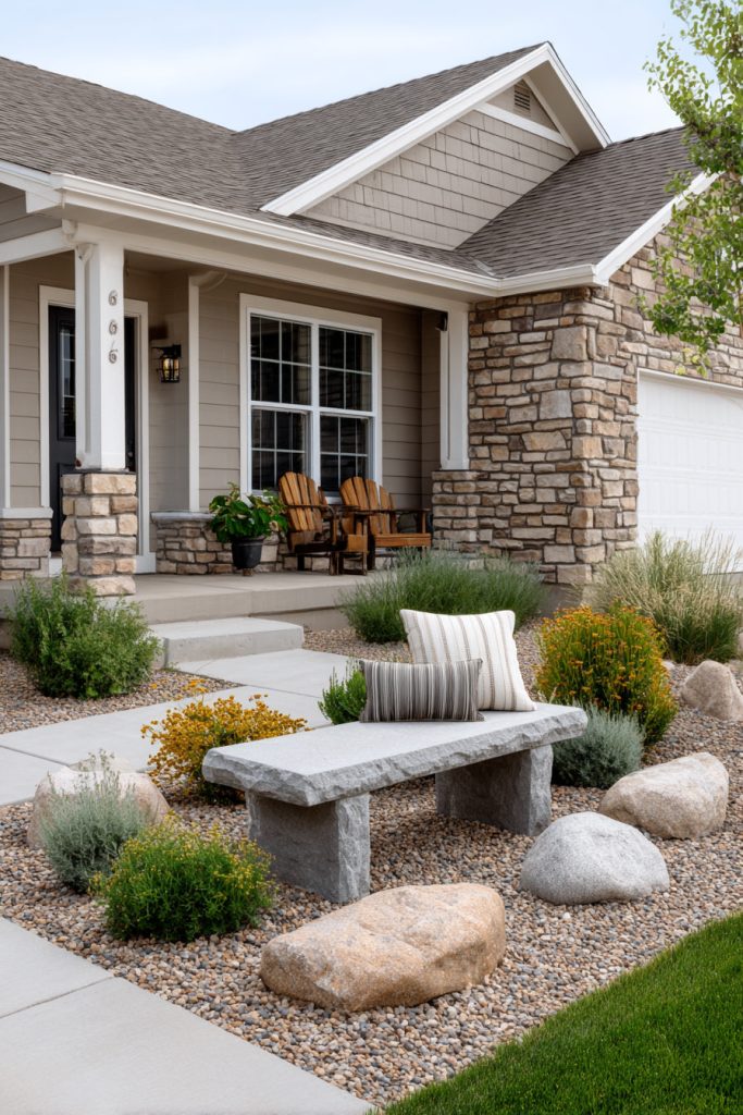 You can add a stone bench to create a cozy spot in your small front yard. It offers a sturdy place to sit and enjoy your garden.
