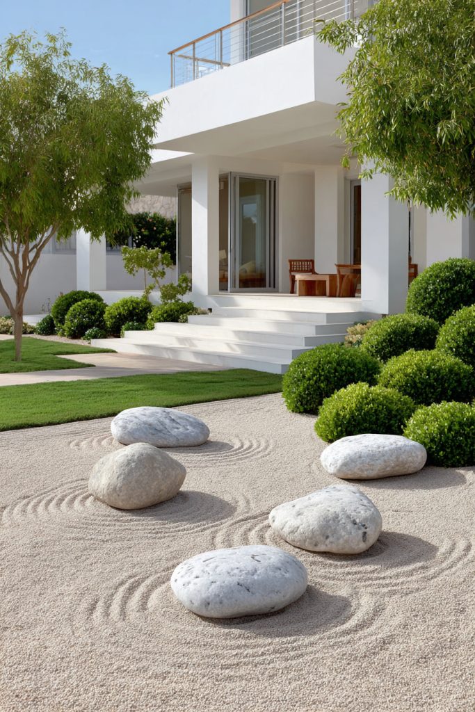 You can create a calm feeling in your front yard using smooth stones and sand. Arrange the stones carefully and rake the sand into simple patterns.