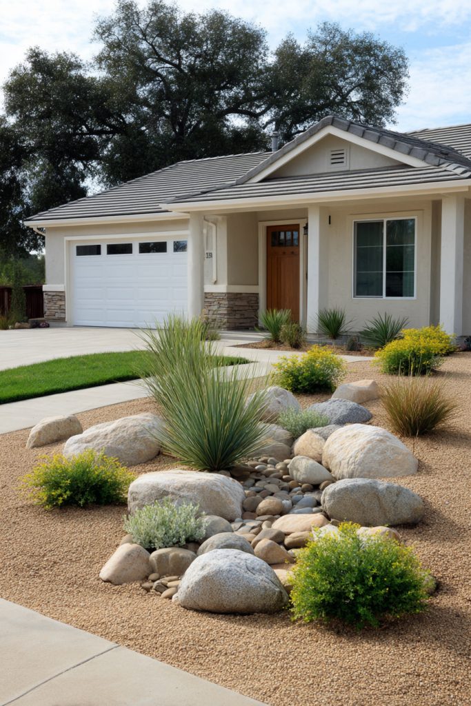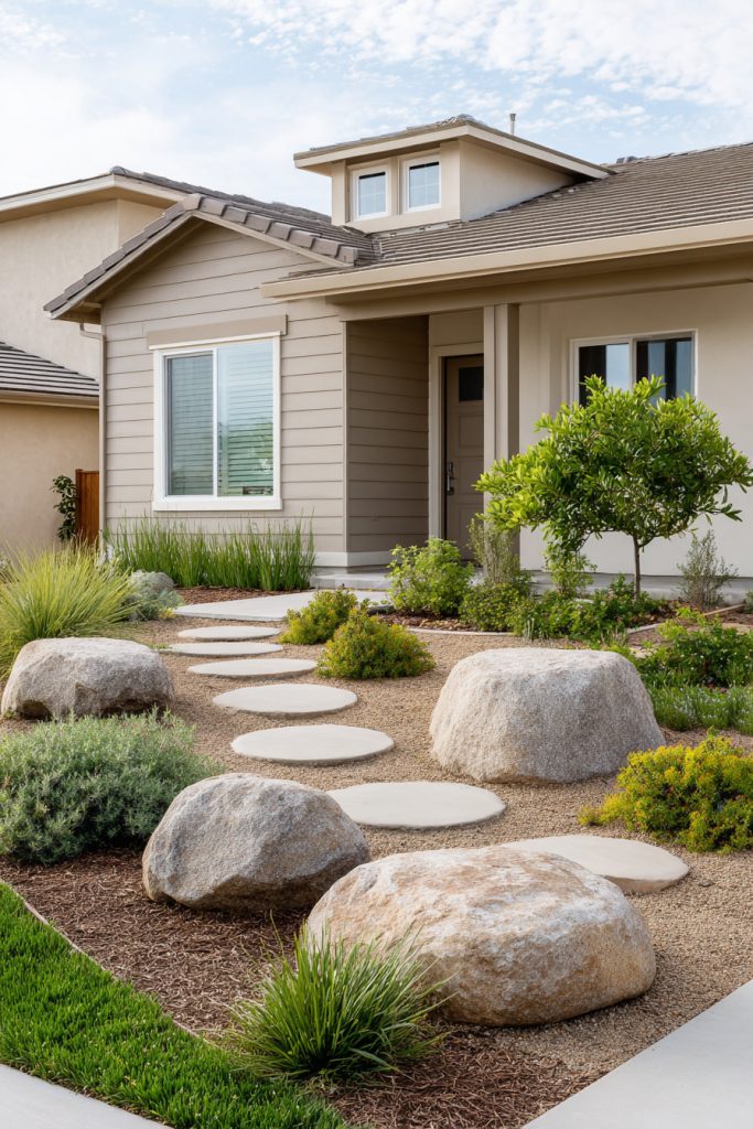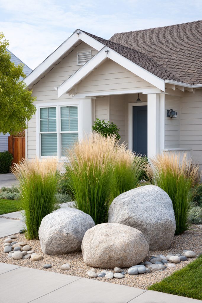 You can create a natural look by grouping boulders together in your front yard. Adding ornamental grasses around the rocks gives a soft, flowing contrast. These grasses are low-maintenance and add texture without crowding small spaces.