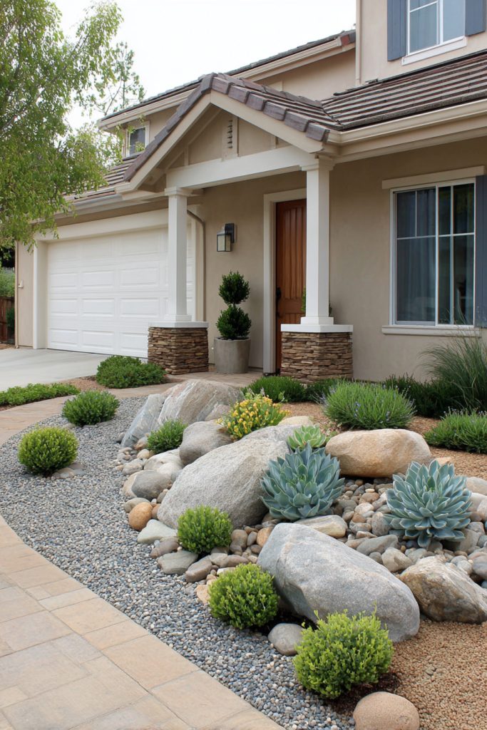 You can create a simple rock garden that fits your small front yard by adding succulents. These plants need little water and look great with stones and gravel.