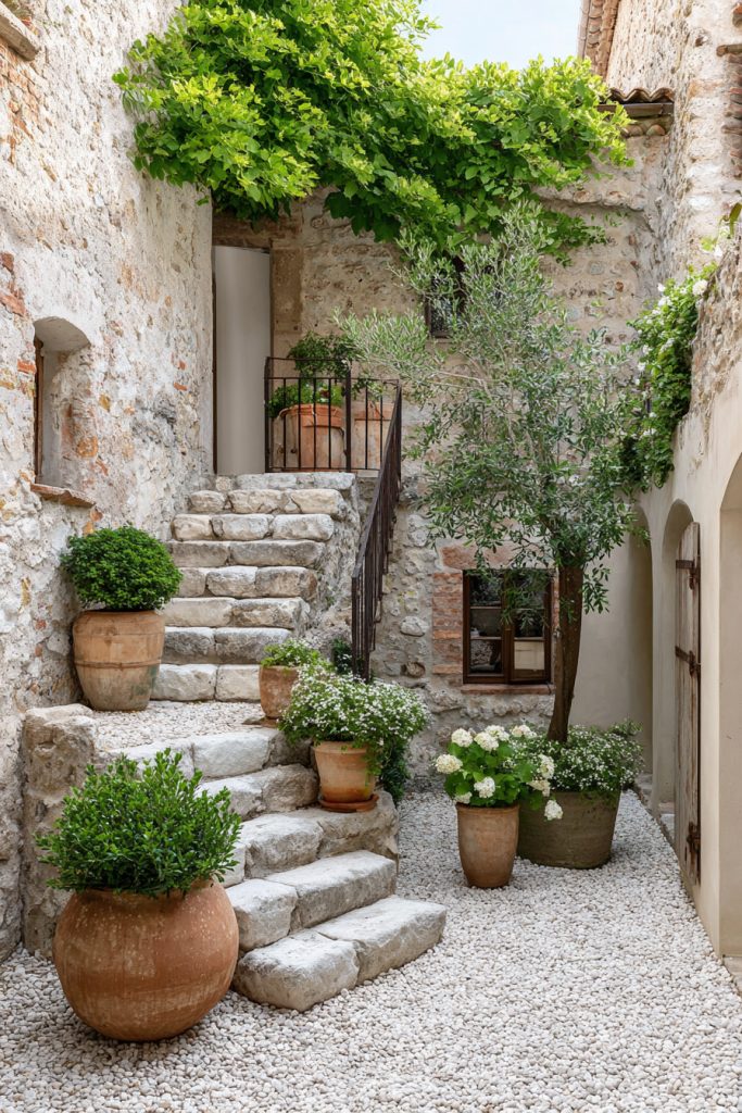 - 20. Tiny gravel courtyard with potted plants