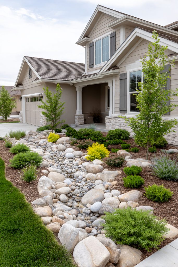 Mix different sizes of stones, like large boulders and small pebbles, for a balanced look. It’s a simple way to solve drainage problems and make your yard more interesting.