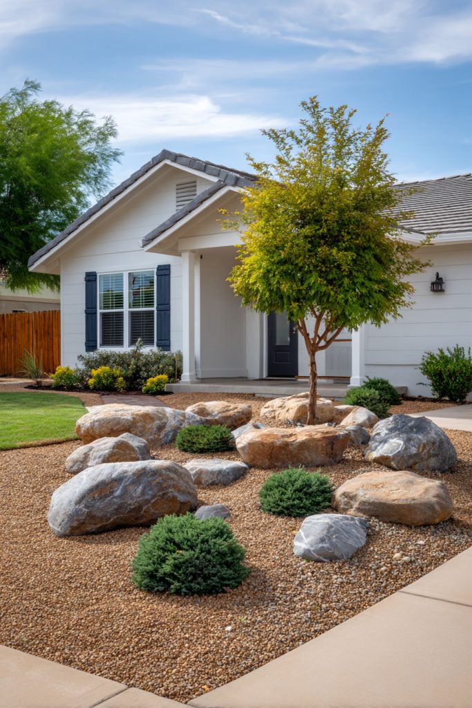 You can create a neat, low-maintenance area by placing rocks and mulch under a small tree. Use mulch close to the tree trunk to keep moisture in and protect roots. Surround it with decorative rocks to add texture and help control weeds. This mix looks nice and saves you time on yard work.