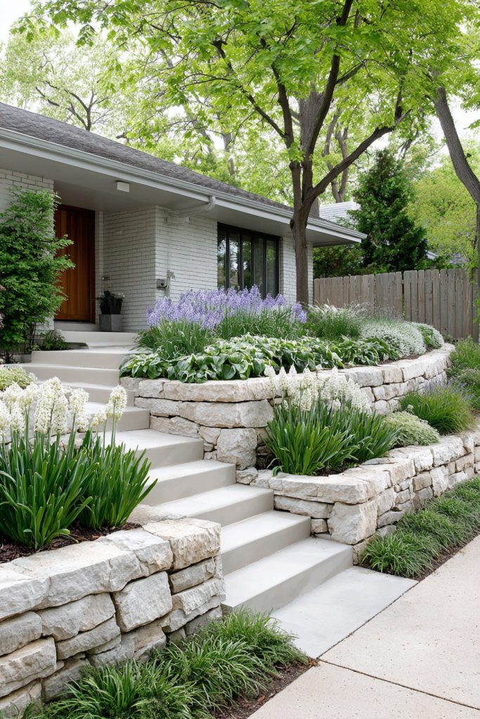 You can use a compact stone wall to create terraces in your small front yard. This helps manage slopes and gives your plants separate levels to grow.