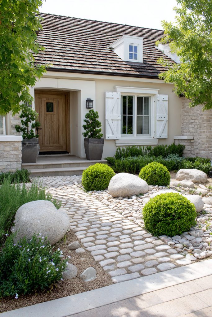 You can add charm to your small front yard with a rustic cobblestone walkway. The uneven stones create a natural, cozy feel that works well with plants and flowers.