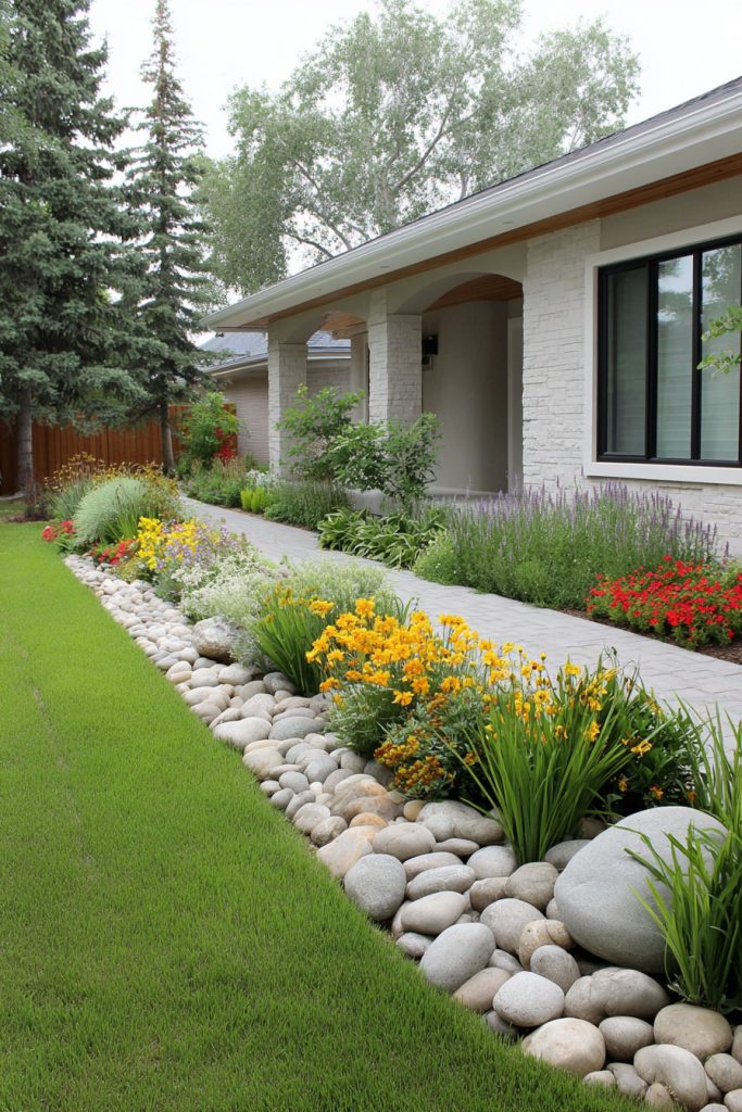 You can add a pop of color to your front yard by using colorful river rocks. These stones create a beautiful contrast against green plants or neutral pathways.