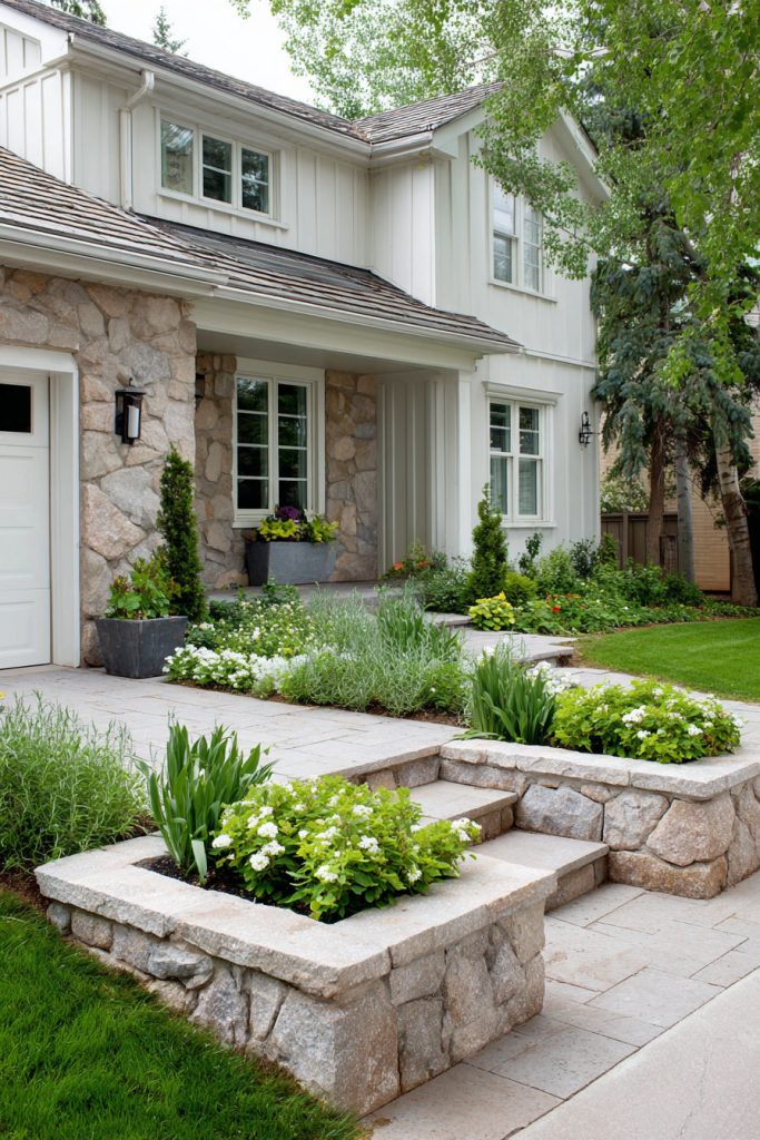 Raised stone planter boxes add height and style to your front yard. They help you grow flowers, herbs, or small plants while keeping things neat.