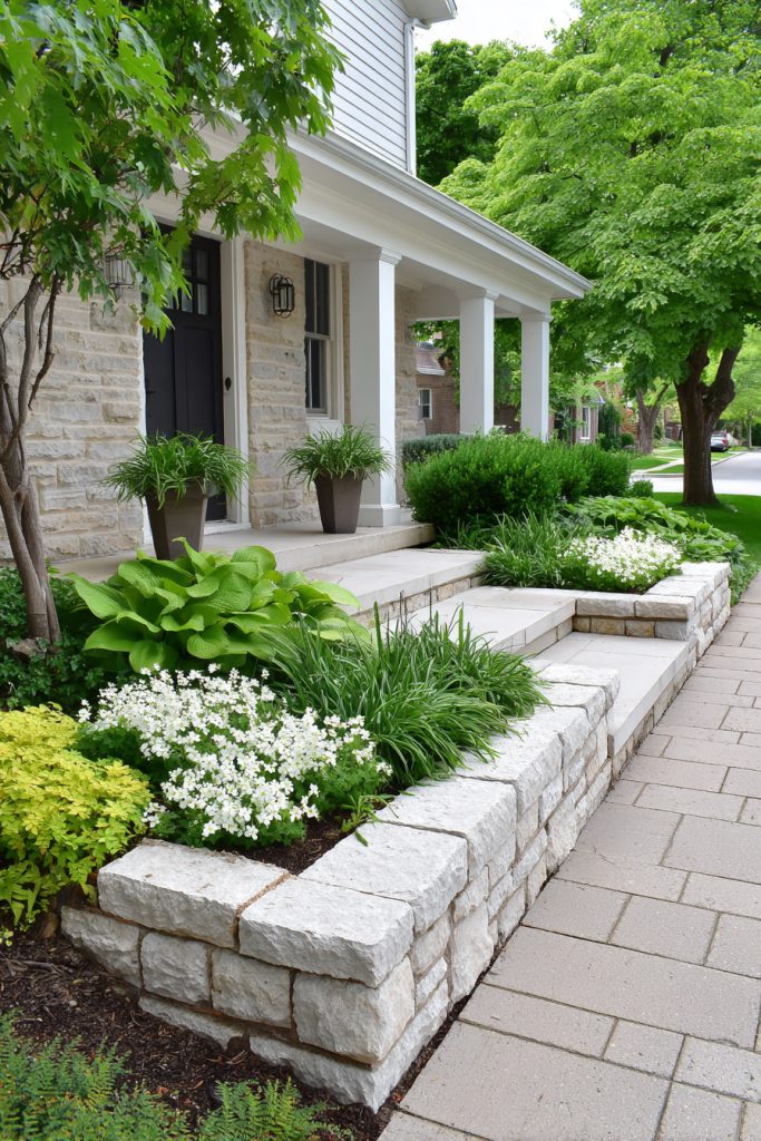 You can add a small stone retaining wall to give your front yard a neat look. It helps keep soil in place while adding a natural touch.
