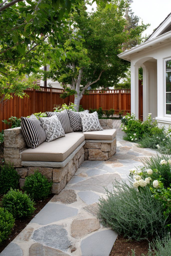 Built-in seating gives you extra spots to relax without needing many chairs. It also blends nicely with the stone, giving a natural look to your yard.