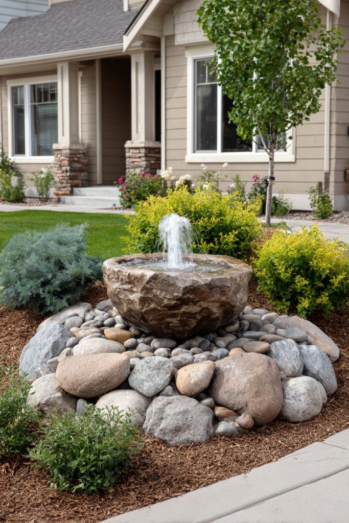 A rock fountain can be a beautiful focal point in your front yard. It adds gentle water sounds that create a calm and inviting space. You can choose natural stones for a rustic look or smooth rocks for a modern touch.