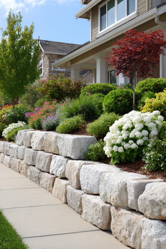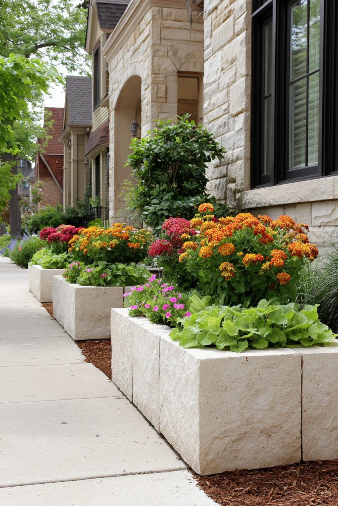 Stone planter boxes add a natural, sturdy look to your front yard. You can plant colorful flowers or small shrubs in them to brighten your space.