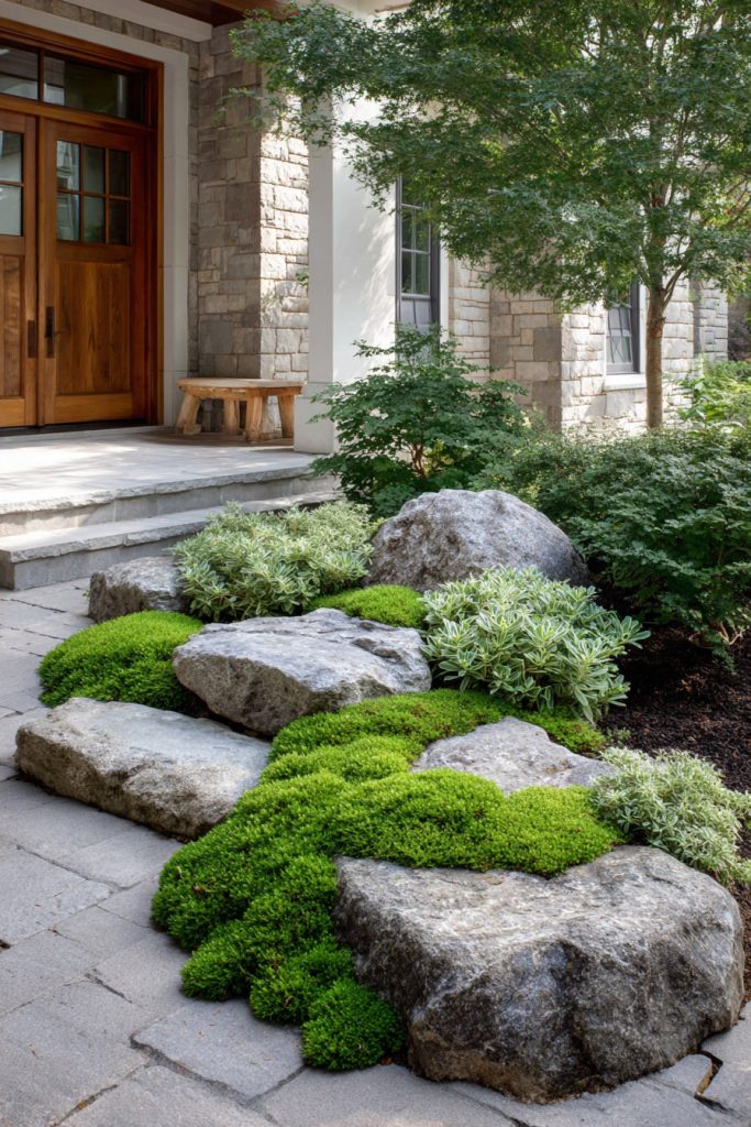 Using irregular stones adds texture and interest. Pair them with low plants or grass to keep the look fresh and inviting all year. This simple design works well for any style of home.