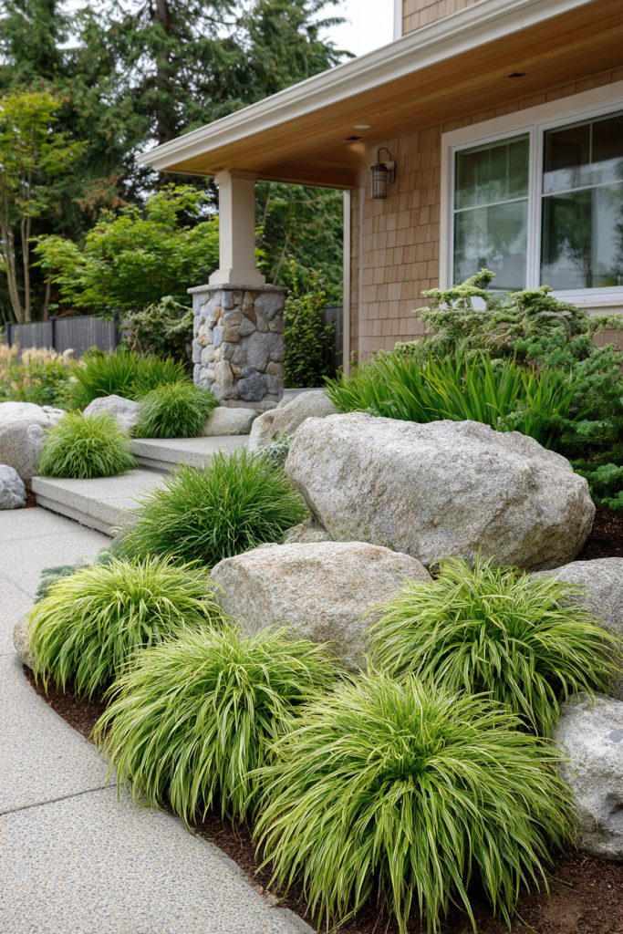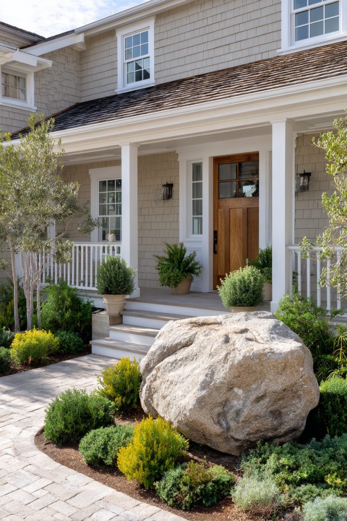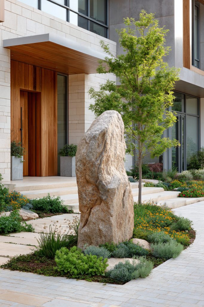 You can place a large boulder near your front door to create a strong focal point. It adds natural texture and draws attention without needing much upkeep.