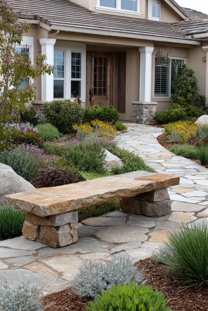 You can make your front yard more inviting with a slate stone patio that includes built-in seating. This design saves space and keeps the area neat.