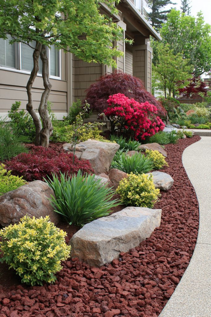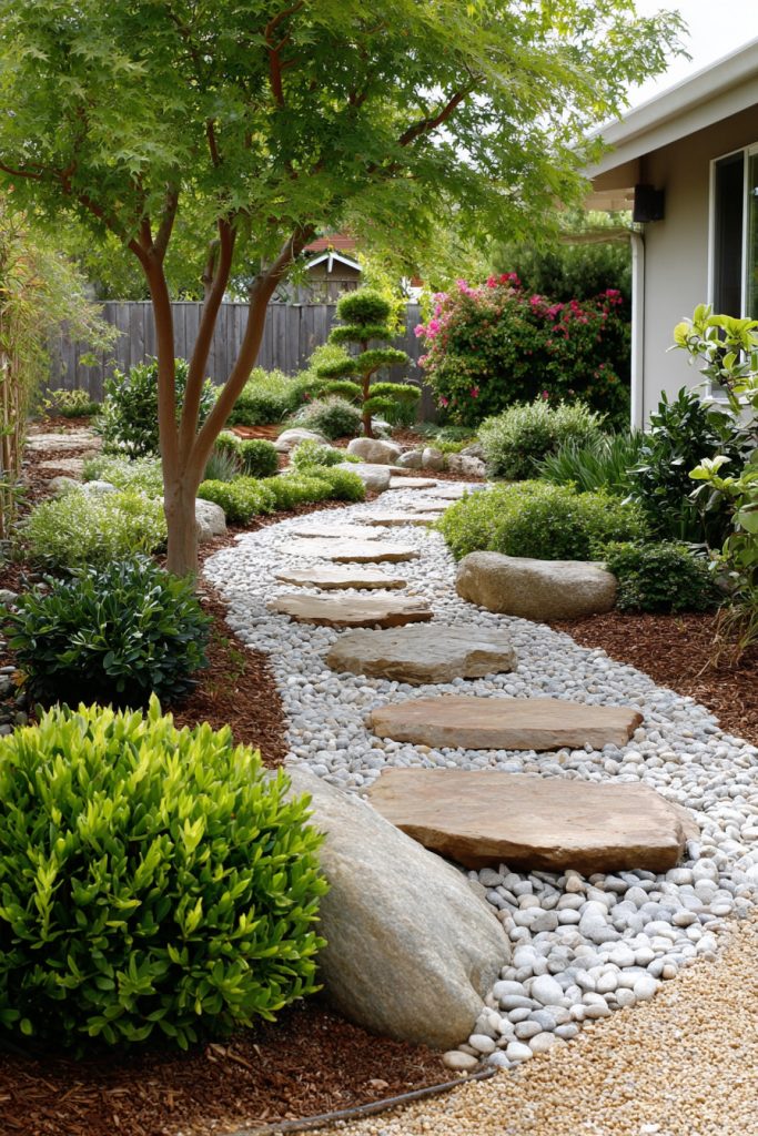 You can create a peaceful spot in your front yard with a Japanese-inspired rock garden. Use simple stones arranged to represent mountains or water. Adding moss or small plants brings more natural beauty.