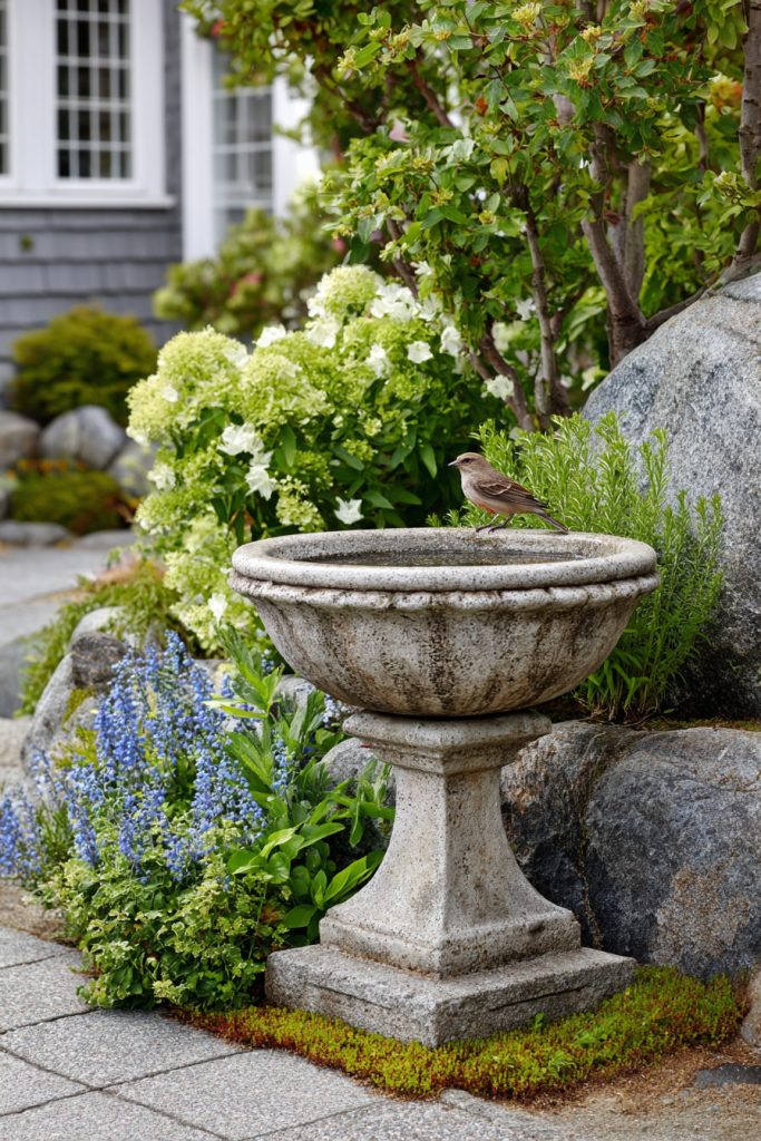 A stone birdbath on a pedestal can add charm to your front yard. It creates a nice spot for birds to drink and splash.
