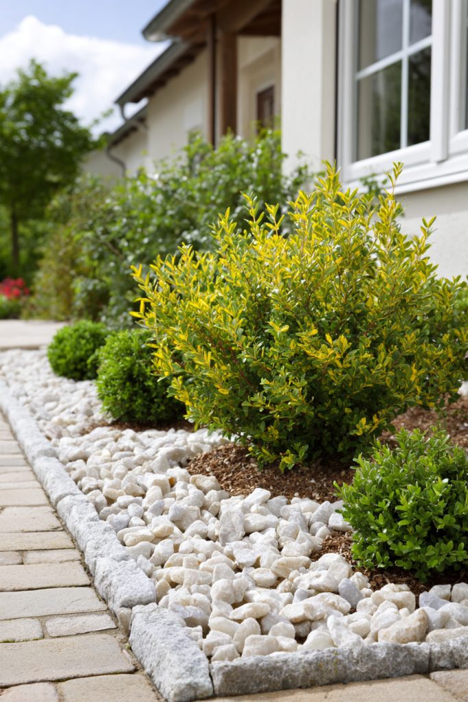 You can use quartz pebbles to create a clean, bright border around your shrubs. This adds a neat look and helps keep weeds away.