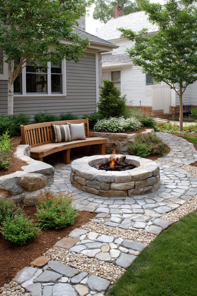 Using natural stones for both the fire pit and benches helps your space look neat and fits well with your yard’s style. It’s perfect for quiet evenings or small gatherings.