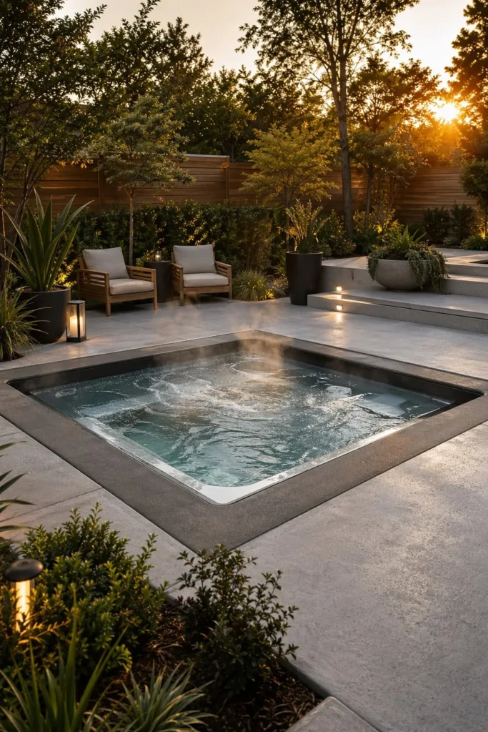 • 1. Modern In-Ground Hot Tub with Concrete Hardscaping