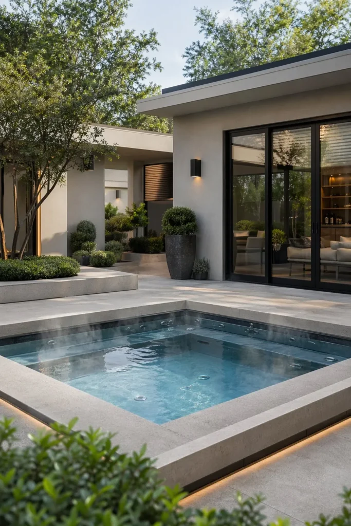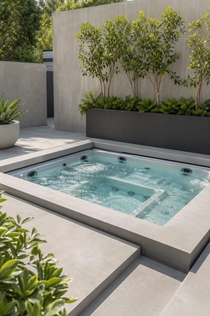 A square spa sunken into concrete feels crisp and architectural. It is one of the strongest choices for modern hardscape ideas backyard with hot tub because every line looks intentional.