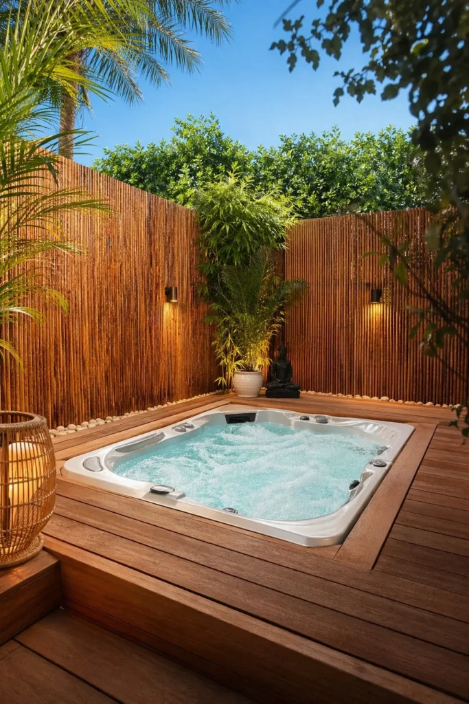 Reed or bamboo-style fencing gives your spa area privacy without making it feel too heavy. It pairs well with wood decking, stone pavers, and lush planting.