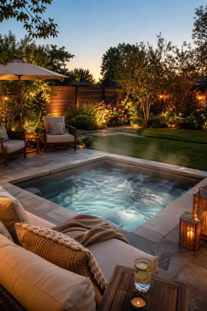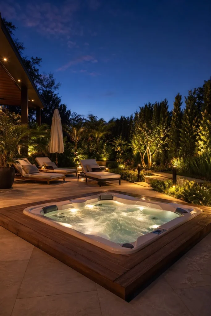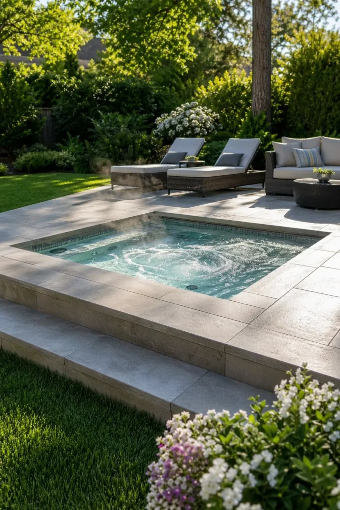 This idea works best in larger backyards with a pool or outdoor kitchen. Keep the spa flush with surrounding surfaces so it stays sleek, not crowded.