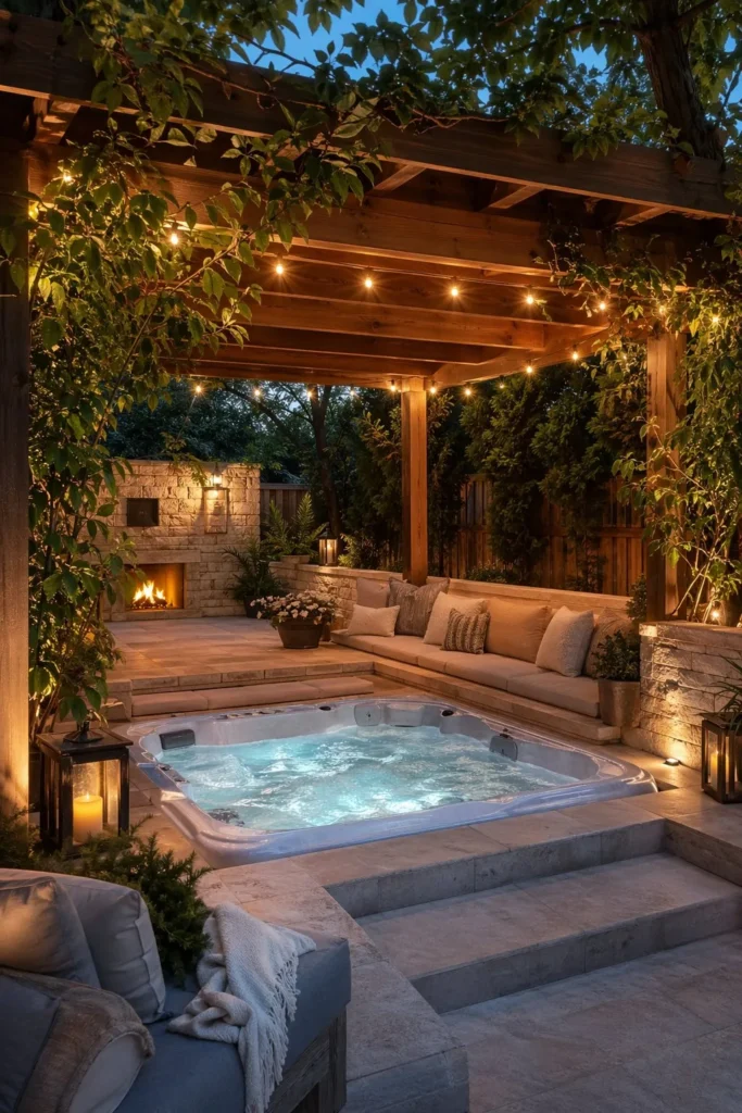 Add curtains, string lights, or climbing vines for softness. This is one of the easiest ways to make a built-in spa area feel sheltered and private.