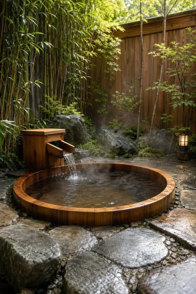 An onsen-inspired tub gives you a quiet, simple design with strong natural materials. Wood, stone, and gravel help the spa feel calm and grounded.