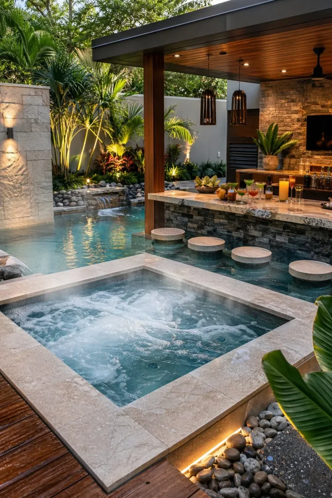 You can use spillover edges, matching tile, and raised coping to make the transition seamless. This setup is ideal if you want both relaxation and a strong visual focal point.