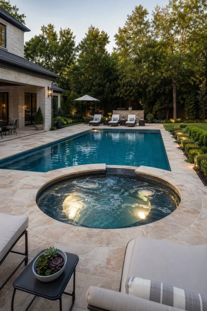A pool hot tub combo gives your yard a polished, resort-style layout. When the spa is built into the same stone deck or coping as the pool, the whole design feels custom and connected.